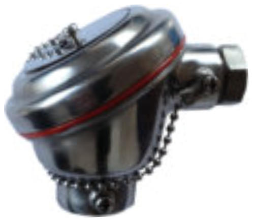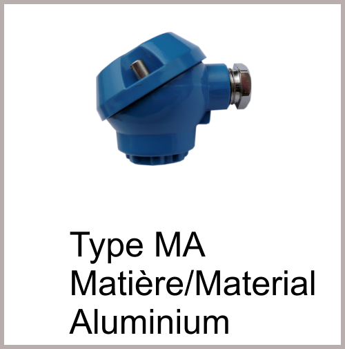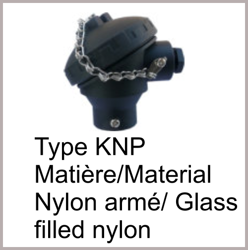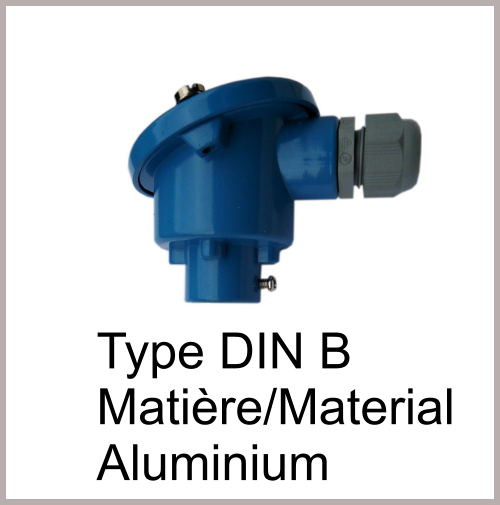 Type de mesure/Type of thermoelement:............Sonde à résistance Pt100 classe A IEC60751 (standard) RTD Pt100 grade A IEC60751 (standard) Temprature d'utilisation -200°C à +600°C suivant montage. Temperature range -200°C to +600°C according manufacturing type. Thermocouple / Thermocouple IEC584 type K (NiCr/NiAl), J (Fe/Cuni),T (Cu/CuNi) Température d'utilisation / Temperature range : -200°C...+1100°C According type of thermocouple and manufacturing.Plage de mesure/ Range :...................................Montage Pt100 fils Téflon / PTFE assembly T°max. -50°C...+250°C Montage Pt100 fils soie de verre / Fiber glass assembly T°max. -50°C...+400°C Montage gaine chemisée à isolant minéral et conducteur nickel. Mineral insulated cable with nickel conductors. T° max : -200°C...+600°C (Pt1100, RTD) Montage TC fils soie de verre / Fiber glass assembly T°max. -40°C...+400°C Montage gaine chemisée à isolant minéral /Mineral insulated TC -200....1100°C. Autre sur demande / Other on requestMontage/Manufacturing:......................................Simple 2 fils, 3 fils (standard) ou 4 fils / double 4 fils, 6 fils (standard) ou 8 fils Single 2 wire, 3 wire (standard) or 4 wire / Dual 4 wire, 6 wire (standard) or 8 wire. Single or dual thermocouple.Gaine de protection/Protection sheath:...............Acier inox 316 L 1.40404 diamètre 6 mm ou 8 mm (standard). 316 L Stainless steel 1.40404 diamètre 6 mm ou 8 mm (standard). Autre sur demande /Other on request. Raccordement procédé/Process connection:......1/2"GCyl (standard) ou NPT (option) / 1/2"BSPP (standard) or NPT (option)Tête de raccordement / Terminal head:...............Montage standard tête type DIN B ou NA en allaige d'aluminium. Entrée électrique par presse étoupe M20x1.5 mm Standard manufacturing terminal head type DIN B or NAA material iron cast. Electric entry cable gland M20x1.5 mm.Connection électrique/ Electric connection:.........Bornier céramique / Ceramic terminal blockTest d'isolement / Isolement resistance:..............>1000 MOhm voltage 250V Amb. T° (Pt100 element) >1000 MOhm votage 500 V DC (thermocouple)Temps de réponse/ Response time:.................... t50=3.5s / t90=8s (Test eau/ water 0.4 m/s selon/ accordance DIN EN60751Options:...............................................................Transmetteur 4-20 mA /Transmitter 4-20 mA